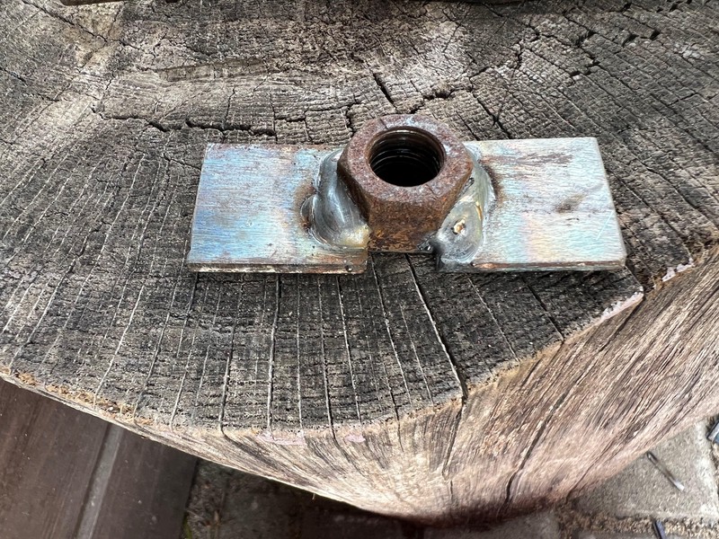 And the most important thing, we figured it out — well, actually Tomek’s Dad figured out how to save the snapped bolts in the chassis beam. He welded two small plates to each of the two nuts, which we inserted through the service holes into the correct position. Then, we secured them with screws so that the plates were positioned against the lower plane of the beam. We then drilled a hole through both the beam and the plate, so that a rivet could be inserted through. It turned out perfectly — the rivet held the nut in the correct position so that we could start the thread, and thanks to the plates, we could properly tighten the bolt (without having a wrench on it), as the plates wedged inside the beam. It was done without cutting or welding anything.