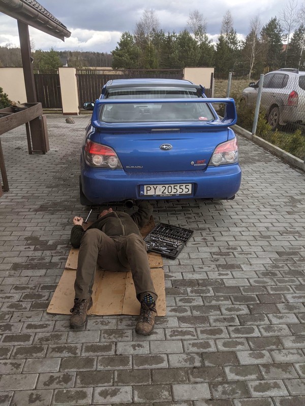 Tomek fixing a rattling exhaust heat shield. We didn’t have a big enough washer, so we hammered down 20 Czech Korunas and drilled through it. I wish I had taken a picture of it.