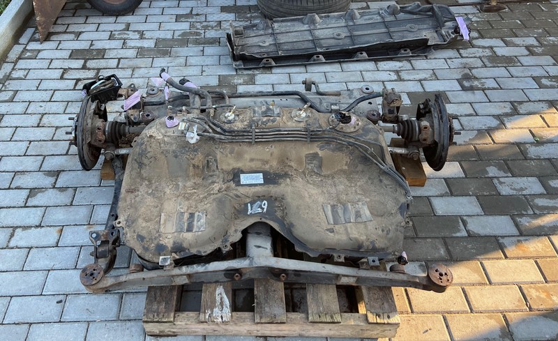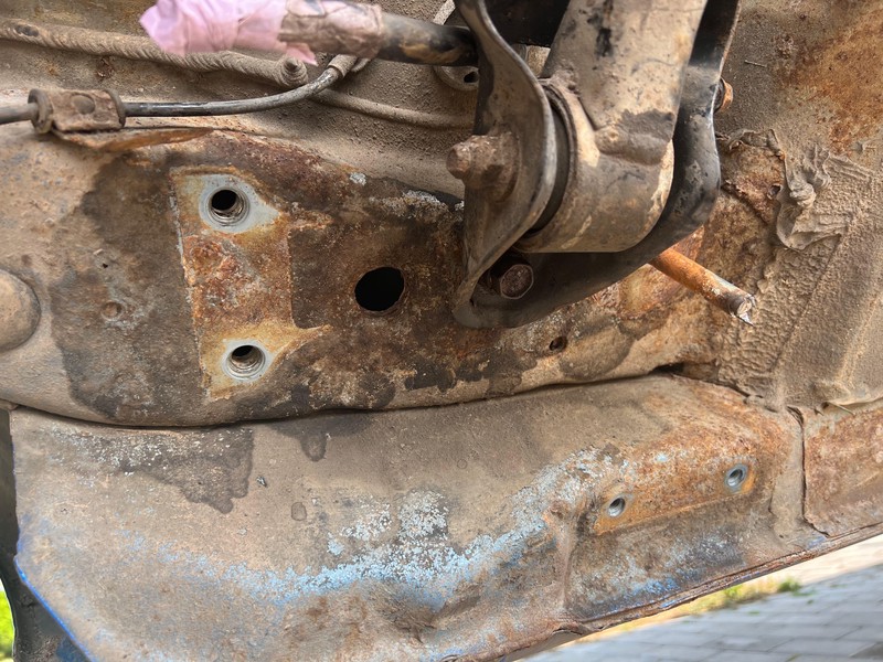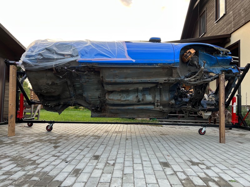 It’s warm, so the car is melting quickly. Today, we dismantled the entire rear suspension: struts, springs, brakes, axles with the differential, the fuel tank, and the rear crossmember. The work is going surprisingly well; Tomek’s dad is well skilled.
