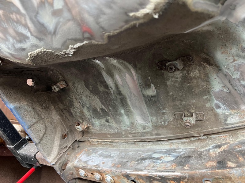 I like this picture quite a lot; it shows the stages nicely: in the middle, bare metal; to the right, covered with Dinitrol RC 900 – rust converted and primer; and finally, on the far right (ahem), still untouched.