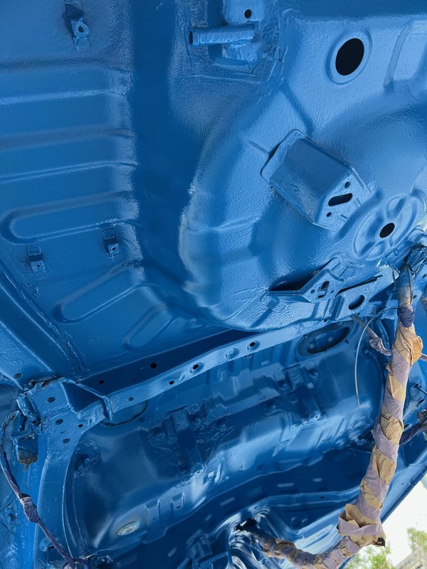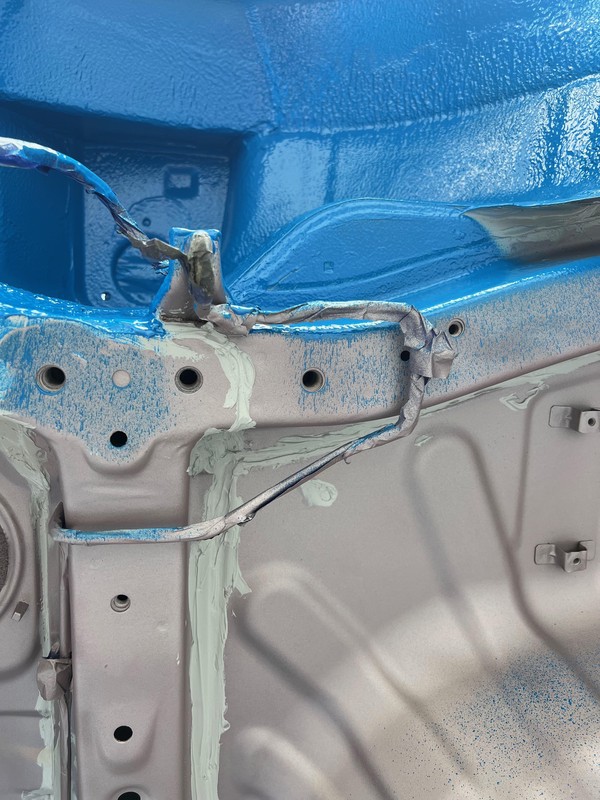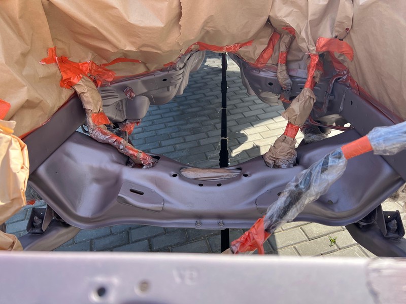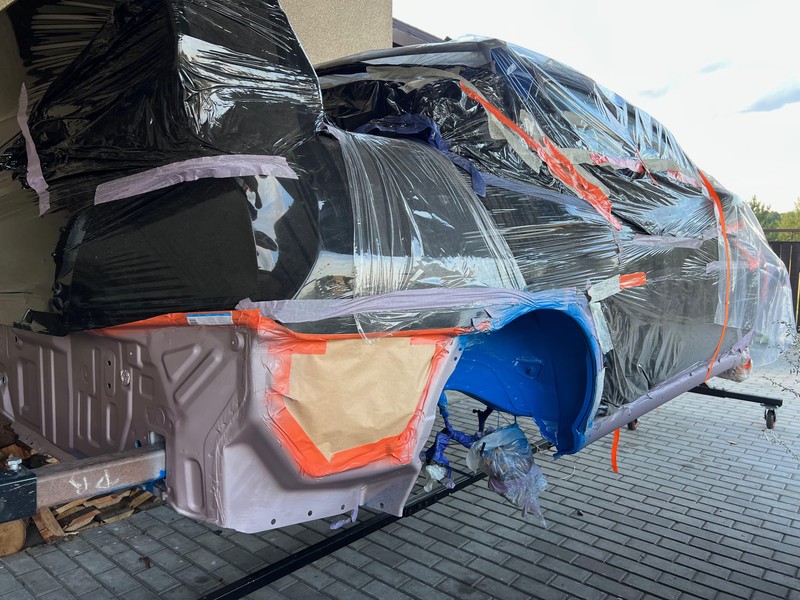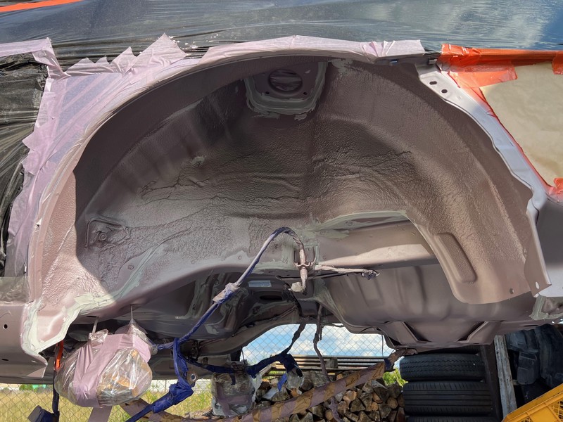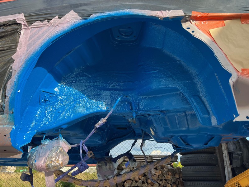 The work’s picking up pace. Today, we opened the first can of Cobra – a textured truck bedliner coating based on two-component polyurethane resins, which is going to make the final layer on the underside of the car. I was a bit apprehensive about this moment and wasn’t sure how RAL 5017 would look on the car. But I think it turned out quite well. Yes, it’s brighter than 02C - World Rally Blue, but once everything that the roads have to offer covers it, it will look class. Cobra on the rear wheel arches and up to the gearbox line: