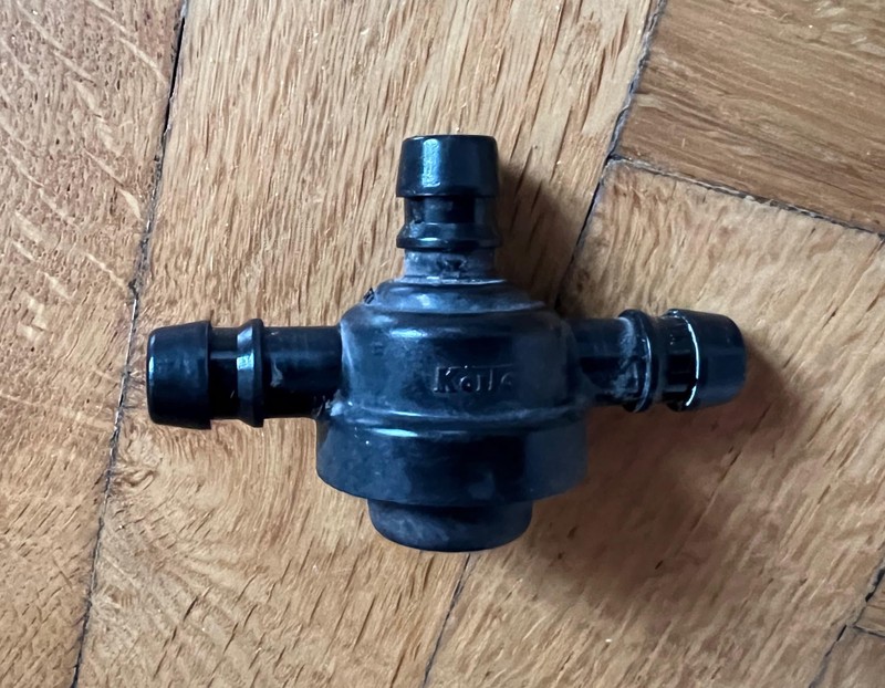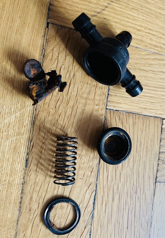 I finally got around to replacing the headlight washer nozzle T-joint. It’s a well-known issue: a spring loaded pressure valve. The washer fluid reservoir has two pumps, one for the windshield and one for the headlights. The headlight pump builds up pressure, the valve opens, and the fluid sprays the headlights. The problem arises when the spring inside the T-joint valve rusts and doesn’t return the valve to close position when the pump stops pumping the fluid, or when the rubber cap that seals the branches wears out. Fluid slowly leaks through the headlight washer nozzles. This can easily be diagnosed by blowing into the T-joint; when you take it out of the lines, the top branch should be closed, while the side ones should be open. Here’s what it looks like: