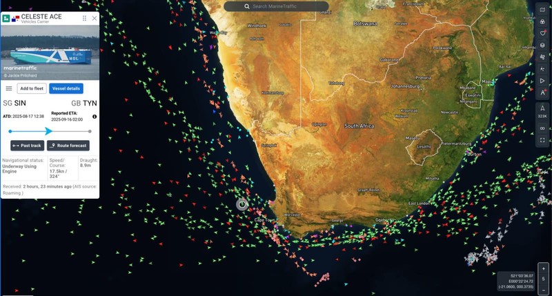 This is not going to stay correct for long, but Celeste Ace has just cleared Cape of Good Hope.
