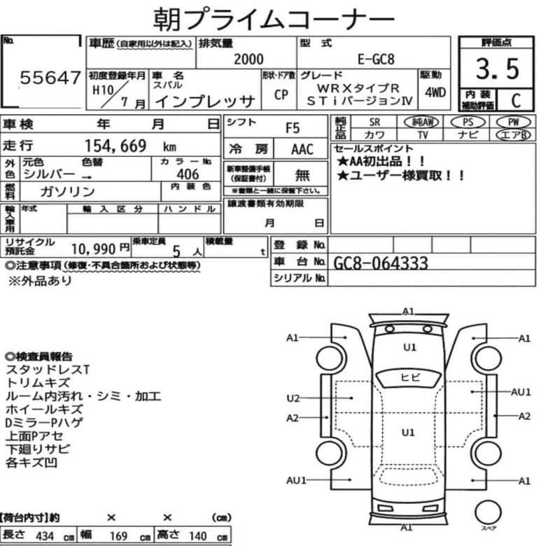 As you can see from the auction sheet, my Type R got an overall 3.5 rating, C for interior (meaning average, age-appropriate condition), and none of the panels had been repaired. A good telltale sign is the presence of original WRX decals, since they’re pricey (and reproductions are only recently available), they usually don’t return after repainting.