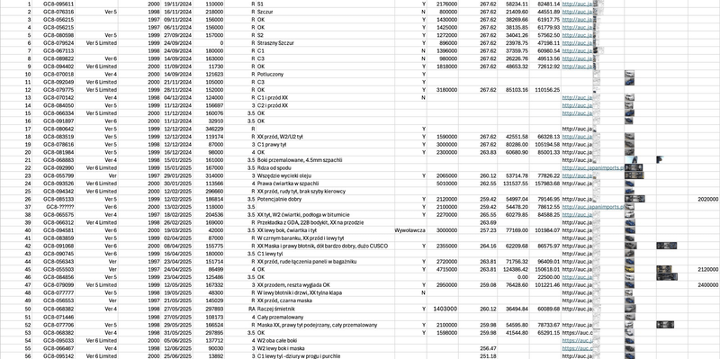 The search took nine months. During that time, 63 cars appeared for sale. I ordered inspections for about 20 of them and bid on 4 - once missing the winning price by less than ¥100,000 (~2000 PLN). I also kept a sales spreadsheet to track trends and have a good “feel for the market”: